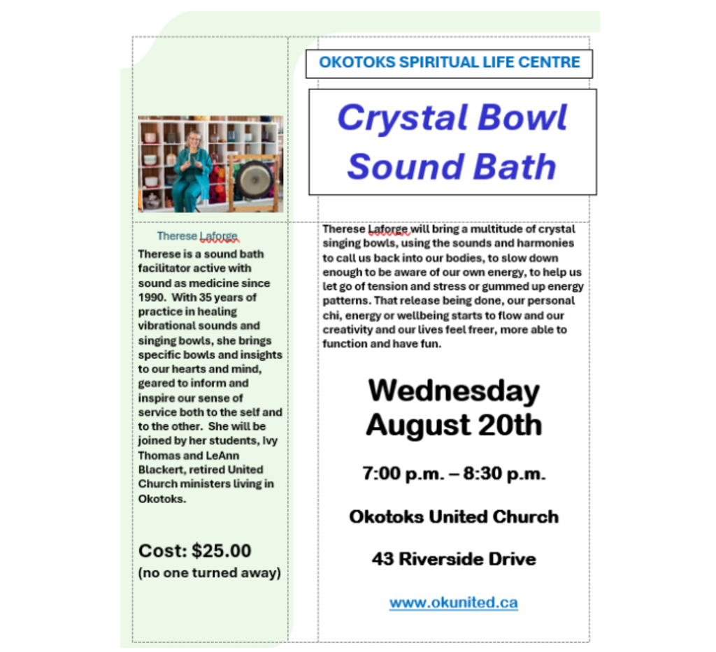 Therese Laforge will bring a multitude of crystal singing bowls, using the sounds and harmonies to call us back into our bodies, to slow down enough to be aware of our own energy, to help us let go of tension and stress or gummed up energy patterns. That release being done, our personal chi, energy or
