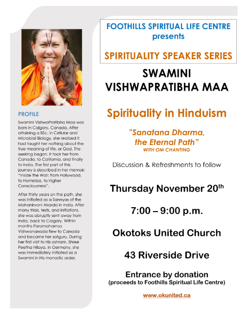 Spirituality Speaker Series - Spirituality in Hinduism - "Sanatana Dharma, the Eternal path with Om chanting" with Swamini Vishwapratibha Maa. Discussion and refreshments to follow. Entrance is by donation with all proceeds going to the Foothills Spiritual Life Centre.
