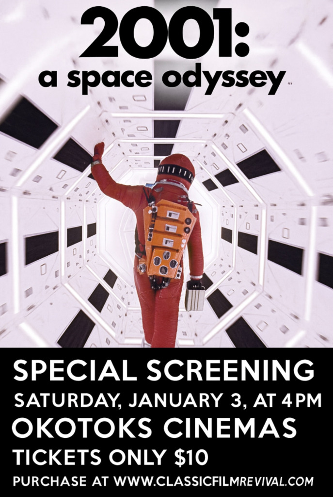 Revisit the 1968 essential Stanley Kubrick masterpiece on the silver screen. The film that changed everything for science fiction and modern cinematography. This is the inaugural event for the "Classic Film Revival" that will be hosting classic and essential films at Okotoks Cinemas the first Saturday of each month.