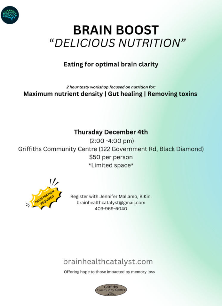 Are you ready to improve your quality of life through better brain clarity? Give yourself the gift of longevity. This 2 hour workshop is designed to ignite a spark that has you motivated to bring joy back into your kitchen while lighting up your neurons! Register by Friday November 21st. Topics include: Best foods for brain health, adding nutrition to your everyday routine (or that of a loved one), the antioxidant power of sprouts, probiotics and their ability to help heal "leaky gut". Taste tests include bone-broth based soups, protein-packed smoothies, healthy, nutrient-dense treats.