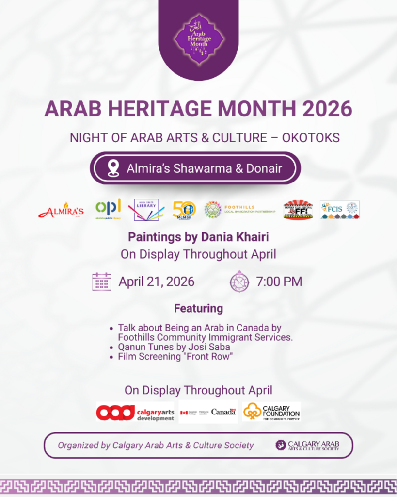 We are hosting an educational and comical night with the help of The Calgary Arab Arts & Culture Society, Foothills Local Immigration Partnership, Foothills Community Immigrant Services, and MORE. Join us for an evening of Culture.